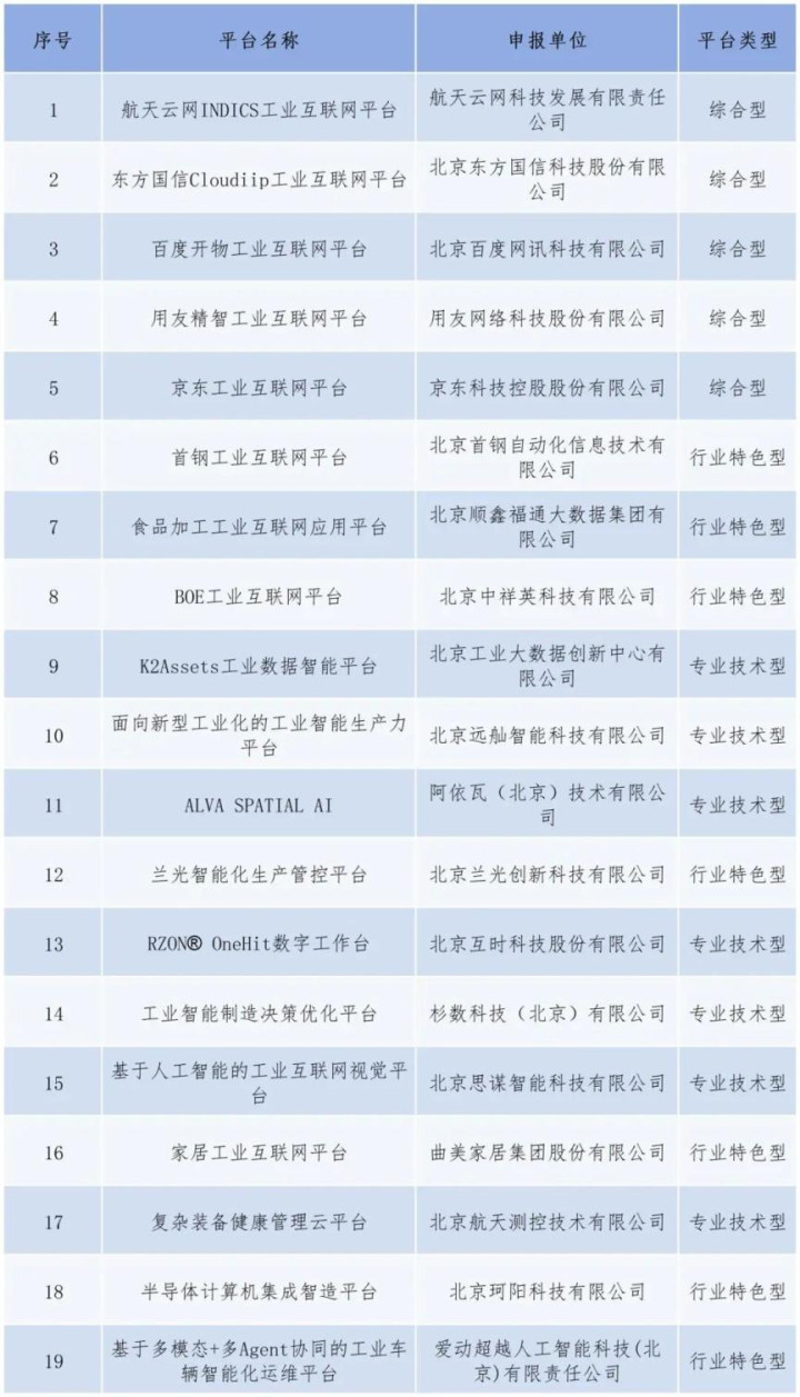 北京市经济和信息化局于2024年首次组织开展北京市工业互联网平台分级分类遴选工作,首批共有19家单位的19个平台入选,其中,综合型平台5个、行业特色型平台7个、专业技术型平台7个。